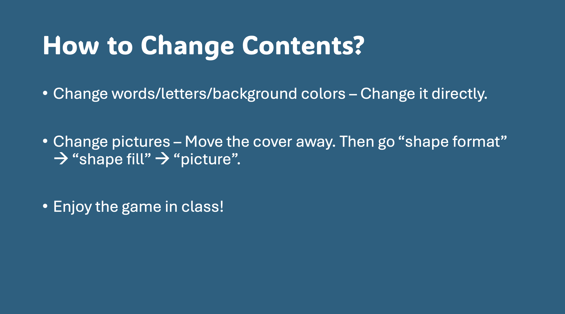 - It includes instructions for users to demonstrate & change contents.